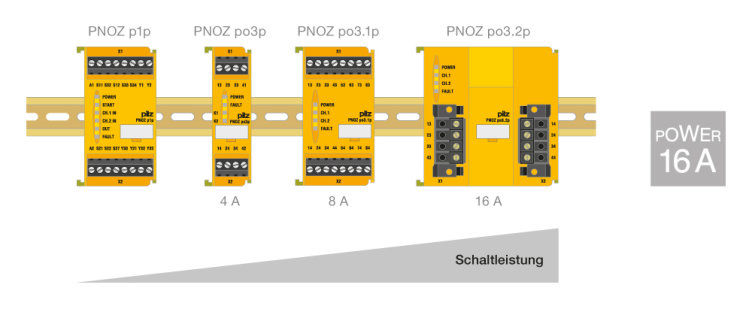 使用 PNOZpower 模块化安全继电器监控急停装置、安全门和光障。您可以使用 PNOZpower 切换高达 16 A 的 AC/DC 电流(每个触点)。每个模块提供 40 A 的总断路能力。
